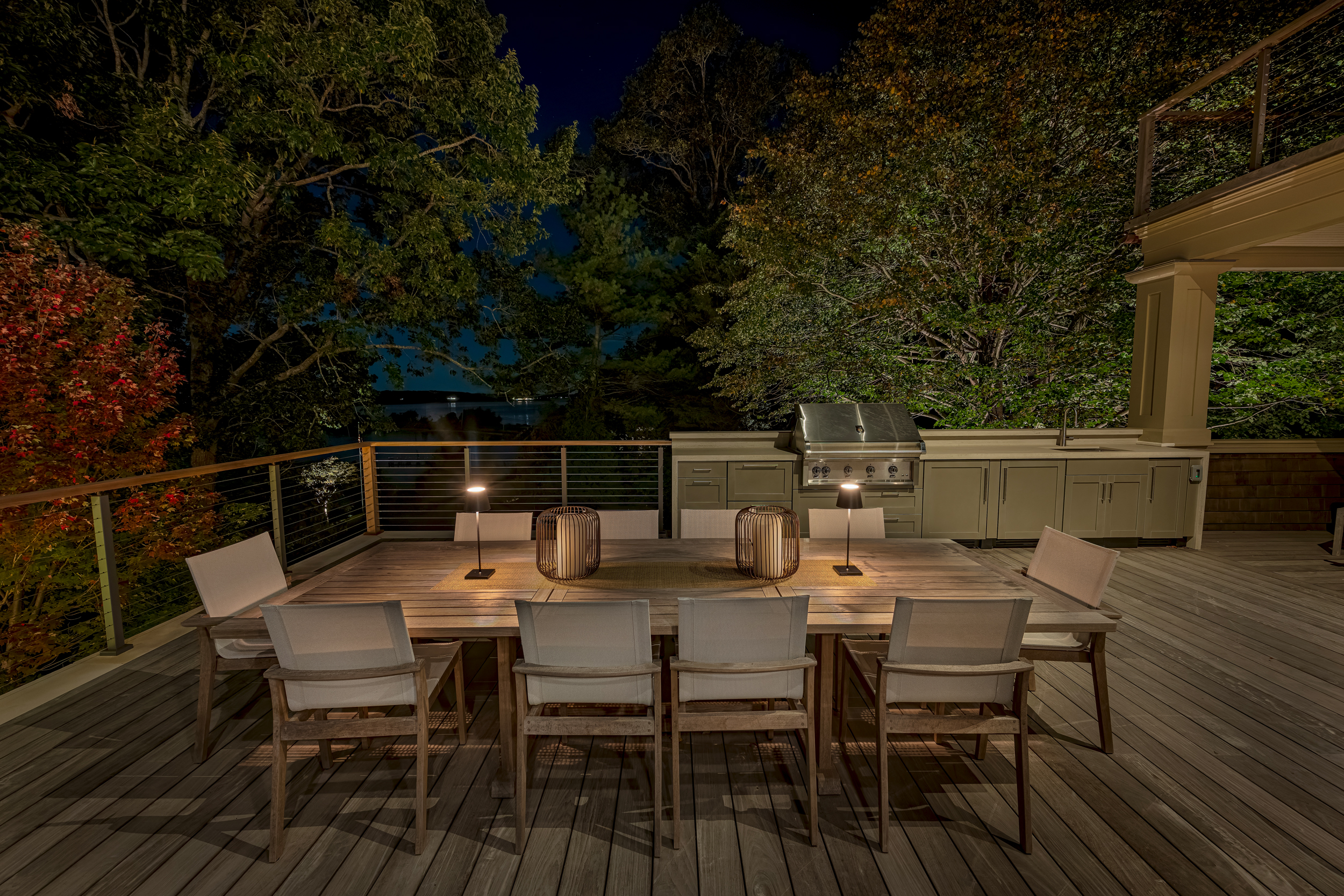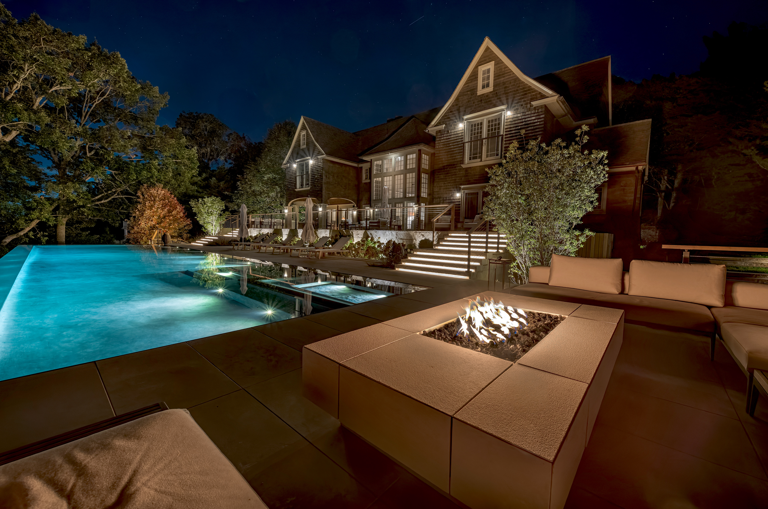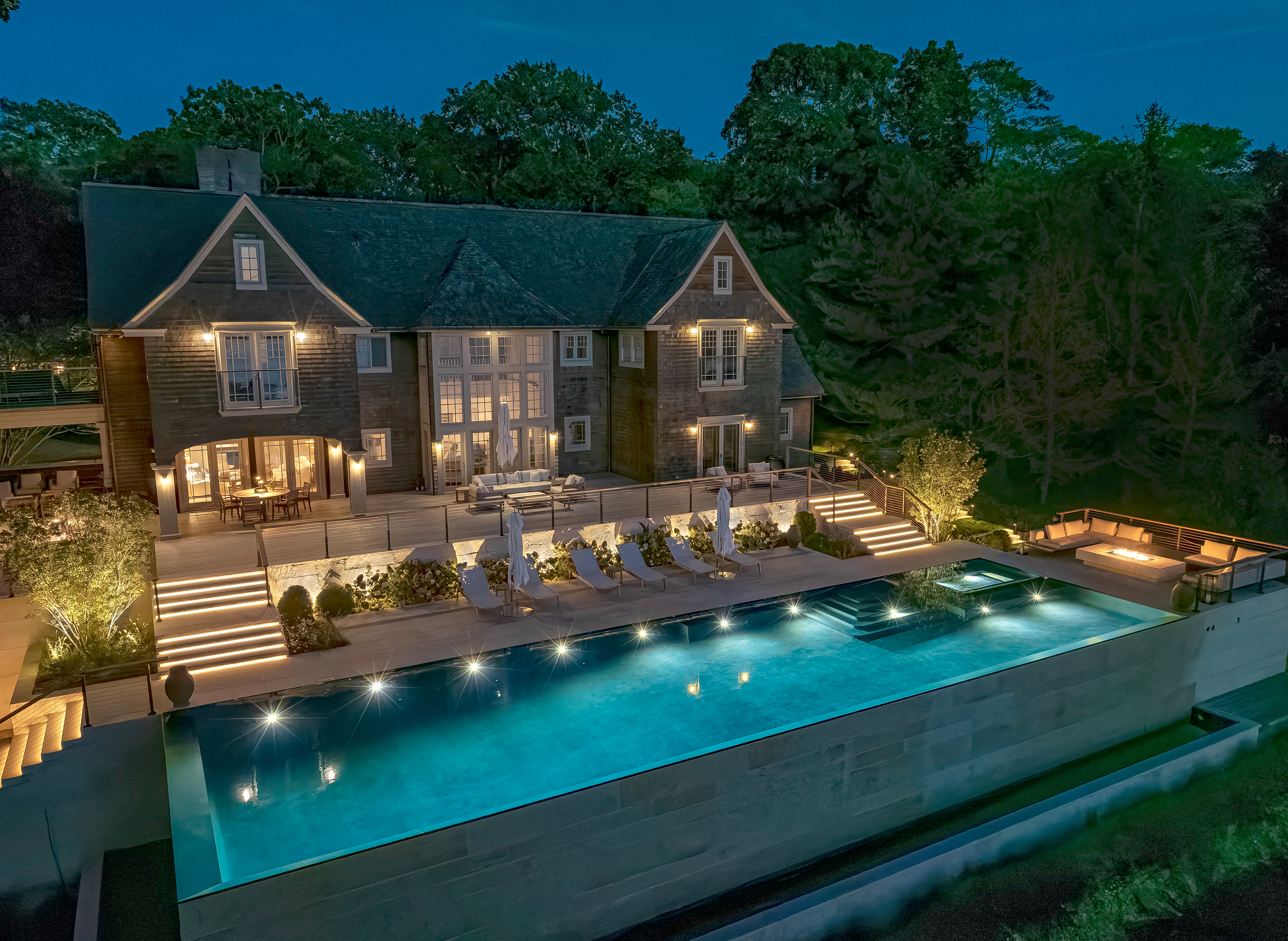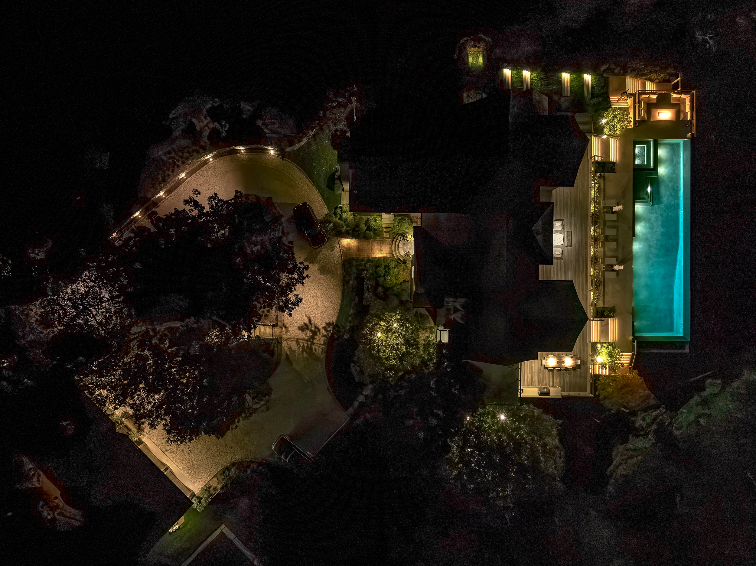 This aerial drone shot showcases the full lighting design across the property, highlighting coverage, layering, and the interplay of illuminated features from a unique overhead perspective