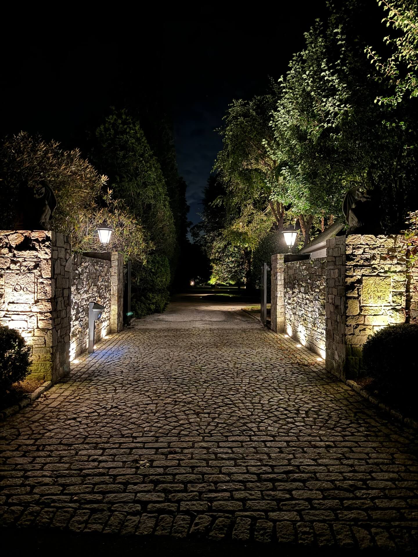 At once, classic, subtle, and grand, this entrance welcomes you. Uplighting warms up the stone entry.